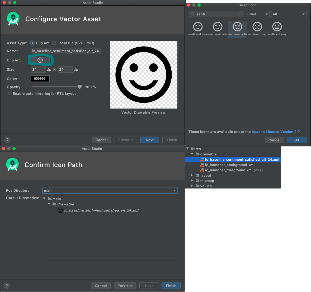 프로젝트 창에서 res폴더에서 우클릭 -> New -> Vector Asset을 클릭하고 다음과 선택한다.