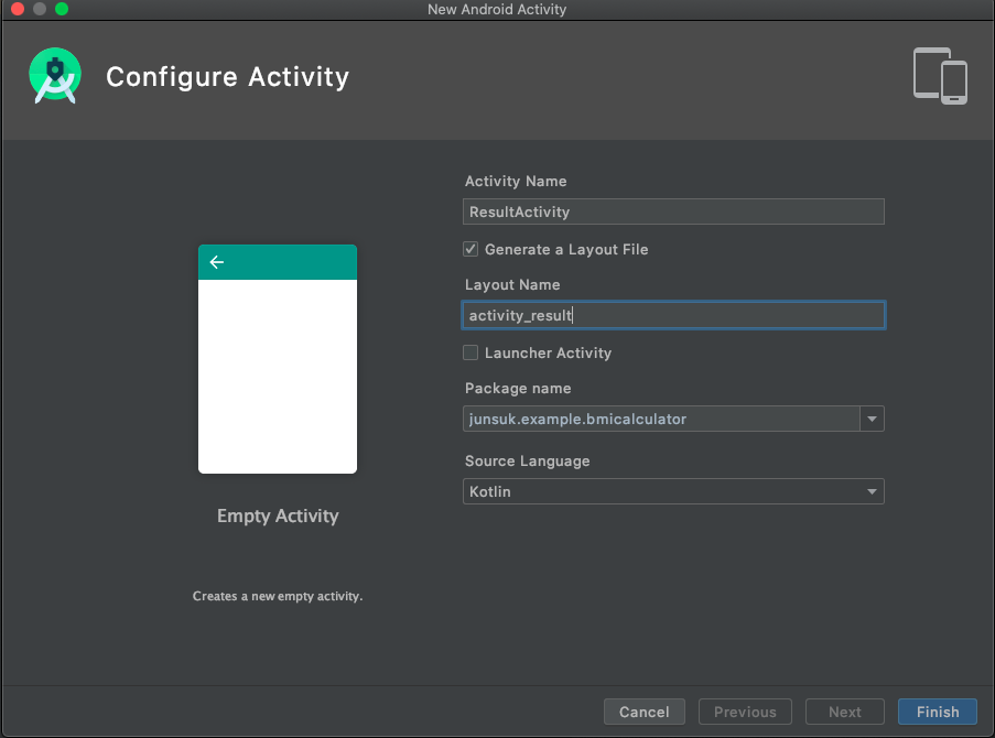 File -> New -> Activity -> Empty Activity 클릭 후 다음과 같이 작성