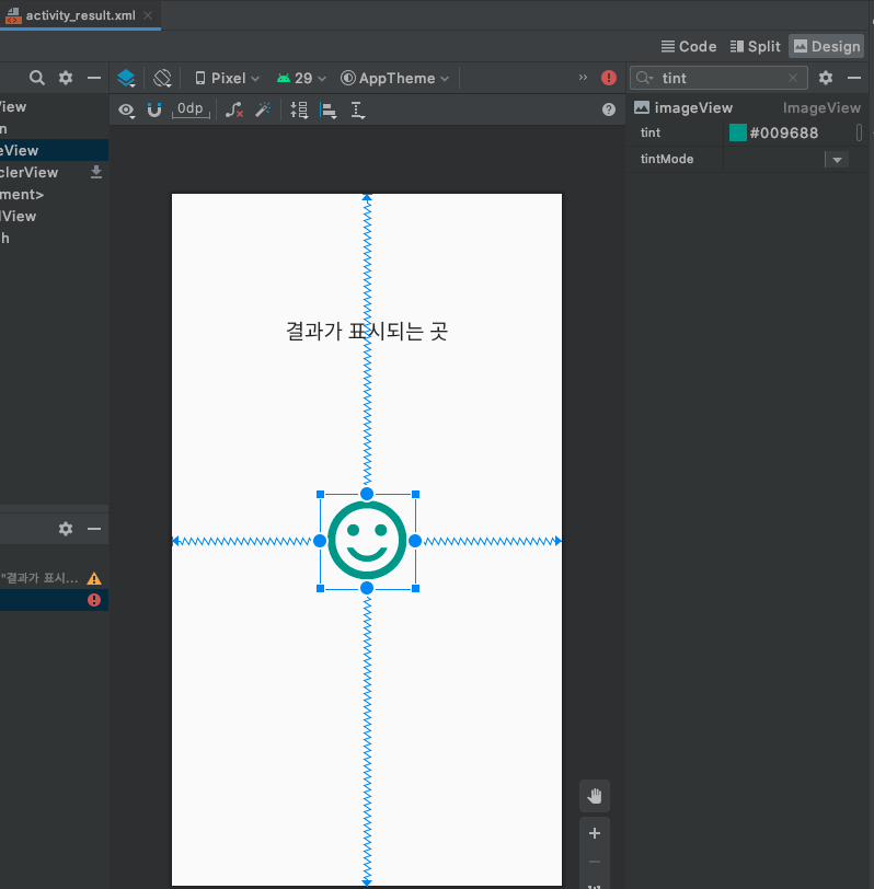 activity_result.xml 레이아웃에서 ImageView를 생성 선택하고, Attribute 속성에서 검색 아이콘 클릭 tint를 검색해여 다음과 같이 색상을 변경한다.