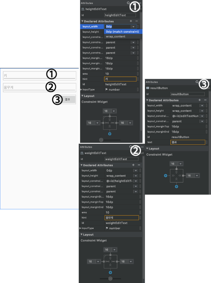 activity_main.xml 레이아웃의 화면을 다음과 같이 작성한다.