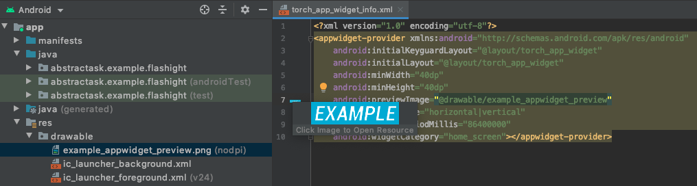 res/xml/torch_app_widget_info.xml 파일에 위젯에 관한 이미지가 설정되어 있고, 이미지를 바꾸고 싶으면 해당파일을 수정하면된다.