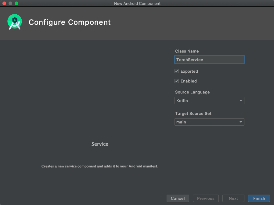 - 클래스명은 TorchService로 하고 Finish를 클릭한다.