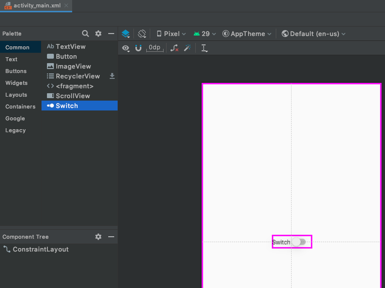 | 배치 | Autoconnect 모드로 Switch를 레이아웃의 중앙에 배치 |