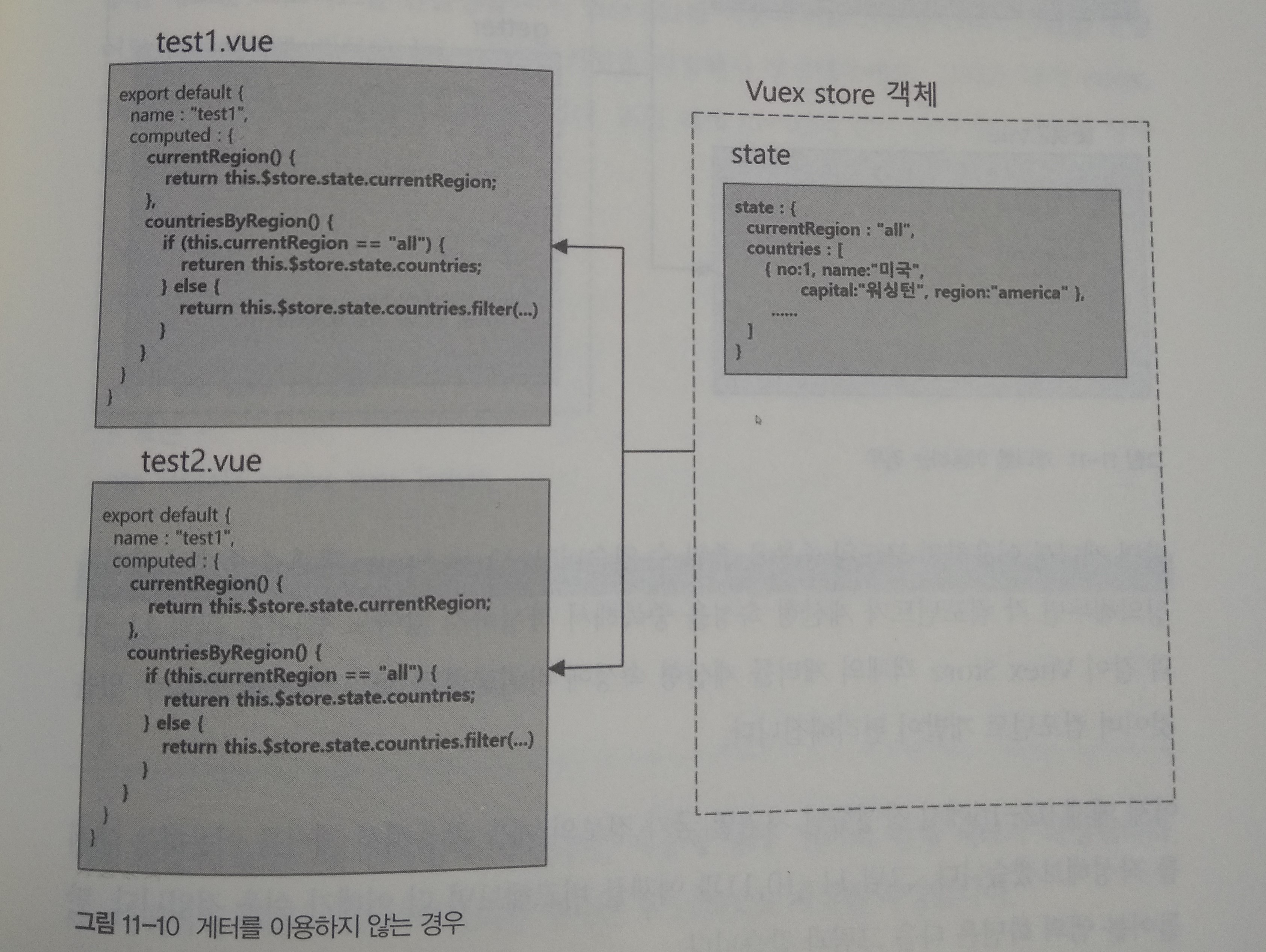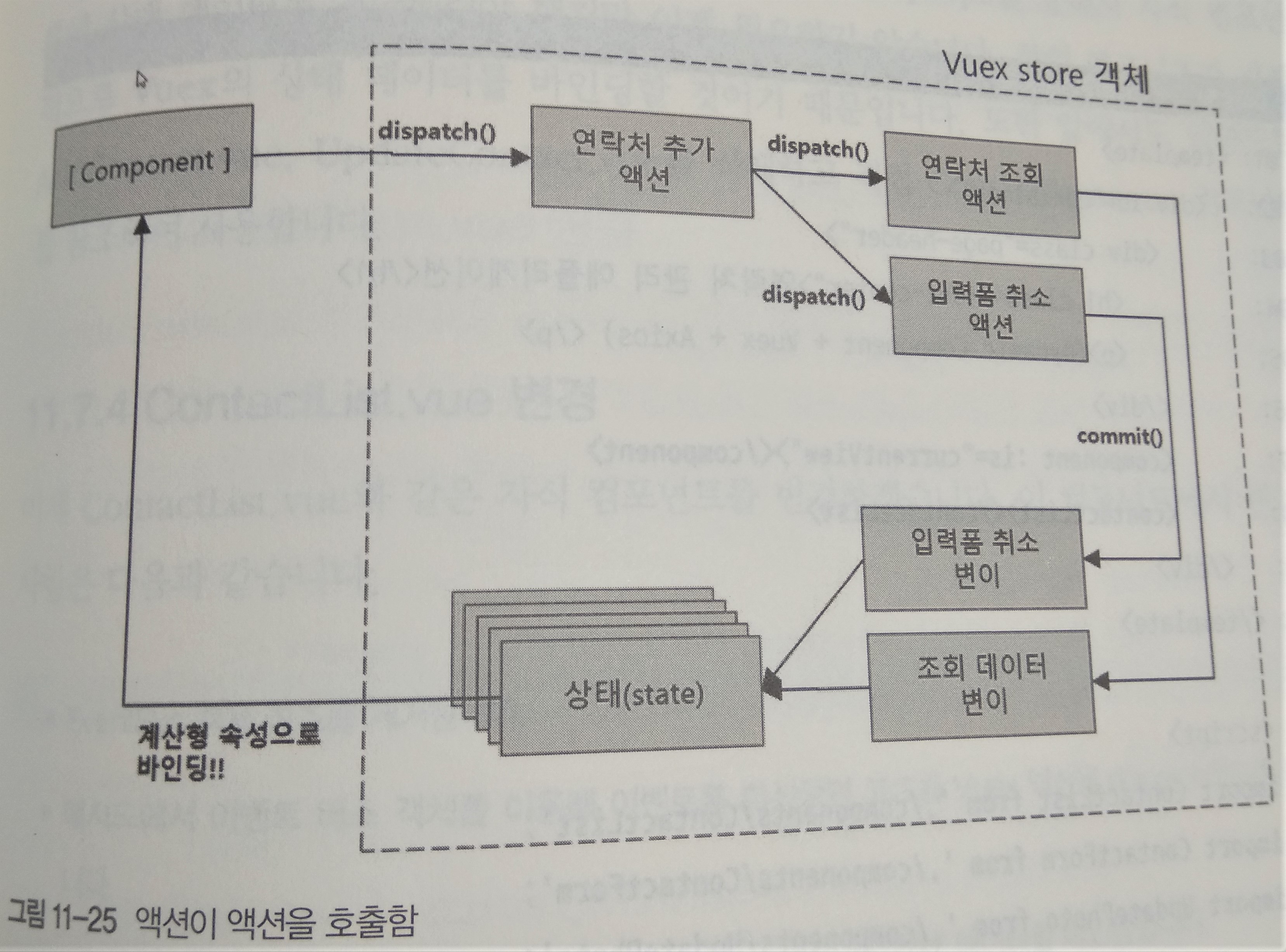 점선으로 표시된 부분이 Vuex 저장소 객체 영역